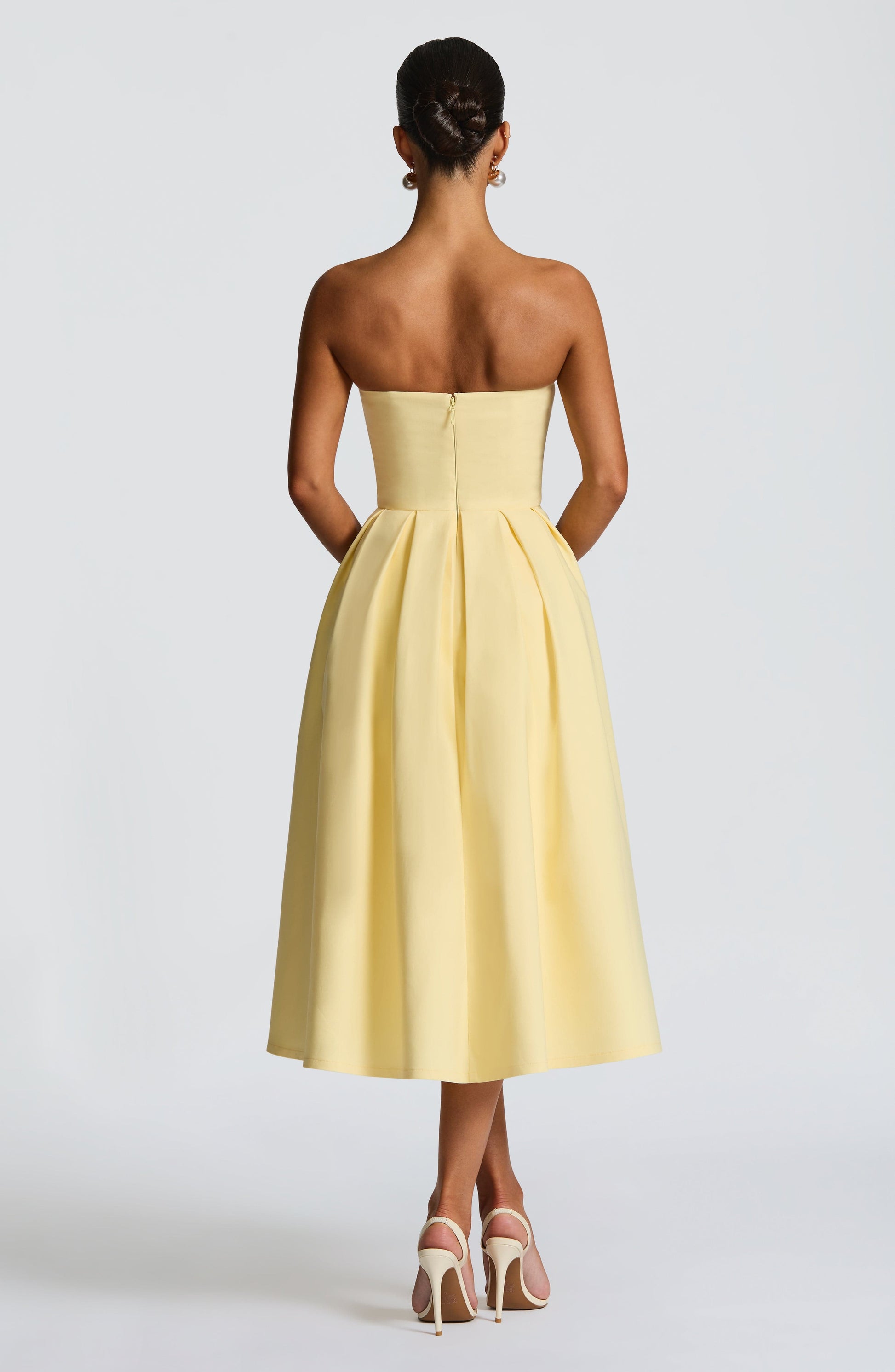 If you’re looking to stand out in a vibrant color without giving up support and structure, the Isalina Strapless Yellow Midi Dress is the perfect balance of aesthetics and functionality.